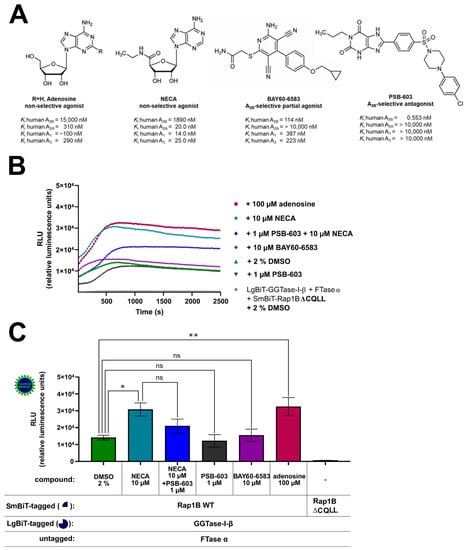 To investigate this further, we examined the effect of A2BAR-selective and non-selective agonists and antagonists on the interaction of GGTase-I and Rap1B in HEK293 cells endogenously expressing A2BARs and A2AARs and recombinant A2BARs (Figure 4A, Supplementary Figures S5 and S6) [,,,]. The non-selective adenosine receptor agonists adenosine 100 µM, 5′-N-ethylcarboxamidoadenosine (NECA) 10 µM, and the A2BAR-selective partial agonist [2-({6-amino-3,5-dicyano-4-[4-(cyclopropylmethoxy)phenyl]pyridin-2-yl}sulfanyl)acetamide] (BAY60-6583) 10 µM were selected in concentrations that achieve maximal intrinsic efficacies in cAMP accumulation assays in HEK293 cells stably expressing A2BARs []. The concentration of the selective A2BAR antagonist 8-(4-(4-(4-chlorophenyl)piperazine-1-sulfonyl)phenyl)-1-propylxanthine (PSB-603) 1 µM was chosen regarding its maximal A2BAR blocking effect (Ki = 0.553 nM) but still preserving selectivity versus A2AAR (Ki > 10,000 nM) (Figure 4A) []. The AR ligand treated complex LgBiT-GGTase-I-β-subunit/FTase α-subunit/SmBiT-Rap1B WT showed similar kinetic properties as the untreated (2% DMSO) LgBiT-GGTase-I-β-subunit/FTase α-subunit/SmBiT-Rap1B WT complex (Figure 4B). Incubation with the non-selective AR receptor agonists NECA (10 µM) and adenosine (100 µM) significantly stimulated the interaction of GGTase-I with Rap1B (* p < 0.05, ** p < 0.01) (Figure 4C). Moreover, also forskolin (10 µM) significantly increased the interaction of GGTase-I with Rap1B (* p < 0.05, Supplementary Figure S7), and its effect was comparable to that of NECA and adenosine (Supplementary Figure S7). The selective A2BAR partial agonist BAY60-6583 (10 µM) and the selective A2BAR antagonist 8-(4-(4-(4-chlorophenyl)piperazine-1-sulfonyl)phenyl)-1-propylxanthine (PSB-603) (1 µM) alone had no influence on GGTase-I/Rap1B complex formation (ns, not significant) (Figure 4C). Pre-incubation with the A2BAR selective antagonist PSB-603 1 µM inhibited the response of 10 µM NECA, but the difference was not significant (Figure 4C).
