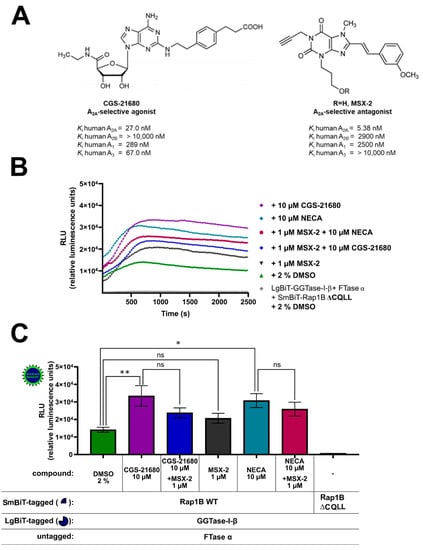 HEK293 cells express both endogenous GαS-coupled A2AAR and A2BAR, and their activation increases intracellular cAMP levels [], which results in PKA activation and might influence the Rap1B phosphorylation and prenylation. To investigate the effect of A2AAR signaling on the interaction of GGTase-I and Rap1B, the A2AAR specific agonist 2-[p-(2-carboxyethyl)phenylethyl-amino]-5′-N-ethylcarboxamido adenosine (CGS-21680) 10 µM and the A2AAR specific antagonist (3-(3-hydroxypropyl)-7-methyl-8-(m-methoxystyryl)-1-propargylxanthine) (MSX-2) 1 µM were utilized. CGS-21680 exhibits high affinity at human A2AAR (Ki = 27.0 nM) and high selectivity versus A2BAR (Ki > 10,000 nM) []. The A2AAR antagonist MSX-2 exhibits a Ki-value of 5.38 nM at human A2AAR and a high selectivity versus A2BAR (Ki = 2900 nM) (Figure 5A) []. The AR ligand-treated complex formation LgBiT-GGTase-I-β-subunit/FTase α-subunit/SmBiT-Rap1B WT showed similar kinetic properties as the untreated (2% DMSO) LgBiT-GGTase-I-β-subunit/FTase-α-subunit/SmBiT-Rap1B WT complex formation (Figure 5B). Incubation with the non-selective AR receptor agonist NECA (10 µM) or with the A2AAR agonist CGS-21680 (10 µM) significantly stimulated the interaction of GGTase-I with Rap1B (* p < 0.05 and ** p < 0.01, respectively) (Figure 5C). The selective A2AAR antagonist MSX-2 (1 µM) alone had no significant influence on GGTase-I/Rap1B interaction (Figure 5C). Pre-incubation with the A2AAR selective antagonist MSX-2 (1 µM) inhibited the response of 10 µM CGS-21680 and slightly the response of 10 µM NECA, but the difference was not significant (Figure 5C).