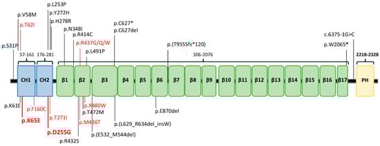 Mutations in the gene encoding β-III spectrin (SPTBN2) lead to autosomal dominant (AD) spinocerebellar ataxia type 5 (SCA5), and spinocerebellar ataxia autosomal recessive type 14 (SCAR14) [,]. The SCA5 variant is more common than SCAR14 [,]. To date, 26 SPTBN2 mutations, distributed along the entire coding region, have been linked to cerebellar ataxia (HGMD® Professional 2020.4; accessed on 19 February 2020) (Figure 1). β-III spectrin consists of three different regions: an N-ter actin-binding domain (ABD), which comprises the calponin homology (CH) domains; a central region containing 17 spectrin (β1-β17) repeat domains; and a C-ter pleckstrin homology (PH) domain.