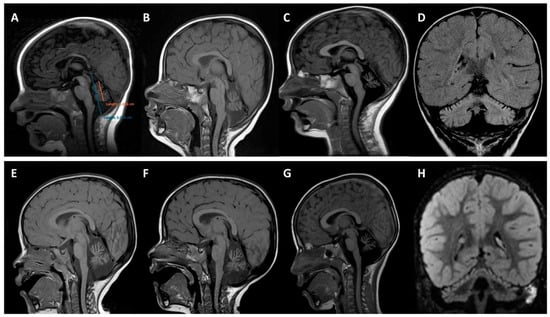 Brain magnetic resonance imaging. Upper panels (A–D) correspond to patient 1 (MD-219; p.K65E) and bottom panels (E–H) to patient 2 (MD-207; p.D255G). (A) Quantitative analysis using midsagittal vermis relative diameter (MVRD). The ratio (vermis diameter/total posterior cranial fossa diameter) was used to express the proportion of both values. The first image (A) corresponds to patient 1 at 4 months old; MVRD resulted in 54%. (B–G) Midline sagittal T1 demonstrating cerebellar vermian atrophy at the age of 12 (B) and 19 months (C) with an MVRD of 48% and 43% respectively, in patient 1; and at the age of 22 months (E), 29 months (F), and 6 years (G), with an MVRD of 59%, 57%, and 50%, respectively, in patient 2. (D,H) coronal fluid-attenuated inversion recovery (FLAIR) images exhibiting global cerebellar atrophy and predominantly superior cerebellar cortical hyperintensity (D) at 19 months old in patient 1, and (H) at 29 months old in patient 2.