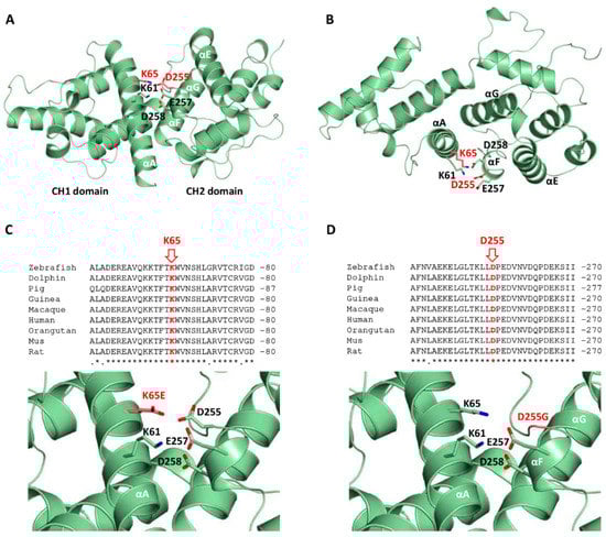 The mutated residues are located in helices A and F, each one belonging to a different CH domain. These charged residues in the native protein are well oriented and at a proper distance to establish a salt bridge, as occurs in the ABD of plectin (Figure 3a,b). Furthermore, these residues are close to several charged residues, including K61 (αA), E257, and D258 (αF), forming a surface salt bridge network contributing to the stabilization of the native structure (Figure 3a,b). The K65E mutation implies the replacement of the cationic and highly conserved residue by a positively charged residue, causing the disruption of the salt bridge with residue D255, and instability of the interface between the CH1 and CH2 domains (Figure 3c). The structure of helix A is probably preserved. Interestingly, the highly conserved residue D255 (Figure 3d) helps to orient lysines 61 and 65 (αA) belonging to the CH2 domain. As a result, the mutation to glycine would cause the loss of these electrostatic interactions, affecting the integrity of the surface salt bridge network. In addition, the introduction of a glycine residue at the N-ter end of helix F may importantly destabilize its secondary structure, causing deleterious effects. Altogether, mutation D255G may cause the perturbation of the interface between the CH1 and CH2 domains, and possibly their mutual three-dimensional arrangement.