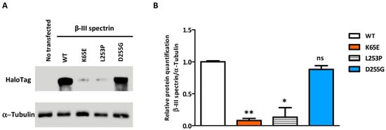 Western blot demonstrating the relative level of β-III spectrin in HeLa cells transfected with the different protein isoforms (WT or the p.K65E, p.L253P, and p.D255G mutants). (A) β-III spectrin immunodetected with an antibody against HaloTag, using tubulin as a load control. (B) Western blot-based quantification of β-III spectrin. Error bars: SEM; * p value < 0.05; ** p value < 0.01; ns: not significant.