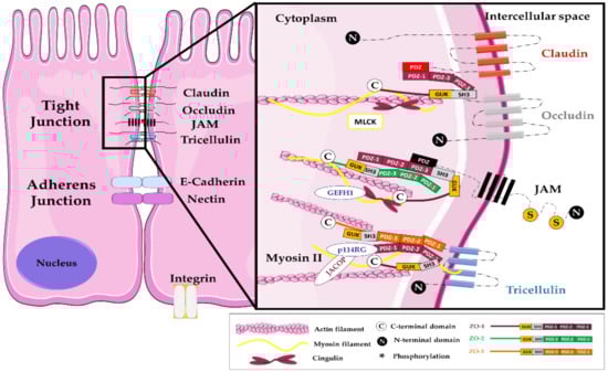 Composition of tight junctions in intestinal epithelial cells. Among the over forty proteins involved in the TJ complex, the transmembrane proteins belong mainly to three groups: the claudins family, the Marvel domain-containing proteins (occludin, tricellulin, also known as MarvelD2 and MarvelD3 proteins), and several immunoglobulin superfamily members ((Junctional Adhesion Molecules (JAMs), Coxsackie and Adenovirus Receptor proteins (CAR)) [17]. Other transmembrane proteins such as BVES (blood vessel epicardial substance), the apical polarity determinant Crb3 (Crumbs Cell Polarity Complex Component 3), and angulins colocalize and interact with TJs at the apical level even if not consensually considered to belong to this junctional complex [18]. These proteins relate to a cytoplasmic plaque formed by adaptor and signaling proteins. Adaptor proteins provide a bridge to the cytoskeleton through actin and microtubule tight bonds and include proteins such as zonula occludens proteins (ZO-1/3), cingulin, paracingulin, also known as junction-associated-coiled-coil protein (JACOP), membrane-associated guanylate kinases (MAGI 1–3), Multi-PDZ domain protein 1 (MUPP1), Pals, PATJ, Partitioning defective 3 and 6 proteins (Par3 and 6), Merlin–angiomotin complex. Signaling proteins complete this complex network, including protein kinases (atypical protein kinase C (aPKC), Mitogen-activated protein kinase kinase (MEKK1), complex Cyclin D1/CDK4, Large tumor suppressor kinase 1 (LATS1)), phosphatases (Phosphatase and TENsin homolog (PTEN)), GTPases and their activators (Rap2c, Myosin-IXA, Rho guanine nucleotide exchange factors (PDZGEF1, p114RhoGEF, GEF-H1, ARHGEF11), RICH1, SH3 domain-binding protein 1 (SH3BP1), Tubulin alpha chain (Tuba)), heat shock proteins (Apg-2), and transcriptional and post-transcriptional regulators ((zonula occludens 1-associated nucleic acid binding protein (ZONAB), Symplekin, yes-associated protein 1 (YAP), tafazzin (TAZ)). The last group of proteins localize with the TJ scaffold proteins but move to the nucleus aimed at modulating gene expression. Therefore, they are involved not only in the regulation of the junctional organization and function but also take part in many cells signaling pathways including cellular proliferation, differentiation, and response to many stimuli.