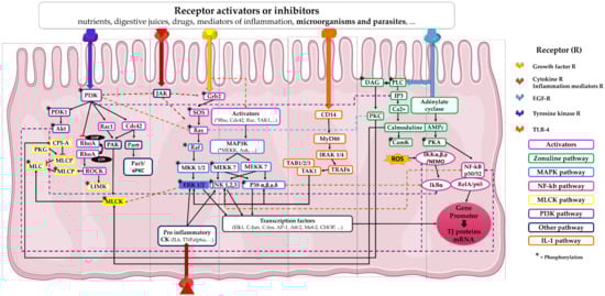 In polarized cells, the peri junctional contractile ring of actin–myosin II intimately interacts with TJ proteins. Consequently, any modification in one of these two connected compartments directly impacts physically the functional organization of the other. For instance, the actin–myosin contraction following the activation of the myosin light-chain kinase (MLCK) mediates intestinal TJ regulation in response to both physiological and pathophysiological stimuli [36]. In the same way, Rho proteins have been suggested to play an important role in maintaining the association of TJs with the membrane [37,38]. Indeed, the kinase ROCK, downstream effector of Rho, is reported to regulate specifically TJs via its effects on the F-actin cytoskeleton [38]. Besides, activation of the EGF receptor, leading to the activation of both β and ε isoforms of the protein kinase C (PKC), as well as the phospholipase C, promotes the stabilization of the actin/myosin ring and consequently the TJ complex [39]. To our knowledge, signaling pathways associated to TJ modulation have been reviewed (i) concomitantly in different cellular models other than intestinal epithelial cells (IECs) or (ii) singly or in a specific context in IECs [40,41,42,43,44,45].