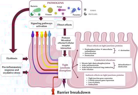 A large community of microorganisms (viruses, bacteria, and fungi) and parasites inhabits the intestinal lumen forming the intestinal microbiota. This microbiota includes commensal microbial species that may, for some, become pathogenic following a disruption of the host defenses. The intestinal epithelial barrier segregates microorganisms and/or their components in the gut lumen considered as an external environment from the sterile deep tissues. The separation is achieved in part by intercellular junctions, especially tight junctions (TJ), which ensure impermeability of the gut barrier, avoiding the translocation of both commensal and pathogenic agents [1,2]. Commensal microorganisms have a protective role for the digestive mucosa by participating in maintaining the physiological integrity of TJs which sustain their barrier function during entero-pathogen challenge [3,4,5,6,7,8]. Among them, probiotics have been reported to potentiate the tightening of TJs, which improve impermeability of the gut mucosa aimed at, among others, counteracting the deleterious action of pathogens upon the TJ complex. In contrast, some pathogenic microorganisms have developed strategies to disorganize the TJs aiming to translocate through the digestive mucosa and invade their host. These entero-pathogens include (i) entero-invasive or entero-toxigenic bacteria (respectively, Shigella, Salmonella, enteroinvasive/enteropathogenic Escherichia coli, Yersinia, Campylobacter, or Vibrio cholerae, enterotoxigenic or hemorrhagic Escherichia coli, Clostridium, and Aeromonas), (ii) enteric viruses that are specific to the digestive tract, such as Norovirus, Astrovirus, and Rotavirus but also viruses such as HIV that can target enterocyte TJs, (iii) parasites causing gastroenteritis (i.e., Entamoeba, Blastocystis, or Giardia), or using intestinal cells as a portal of entry for their dissemination (i.e., Toxoplasma gondii), and (iv) fungi, including the yeast Candida albicans belonging to the gut mycobiote, and other fungi such as Aspergillus and Penicillium that are transitory hosts of the food bolus.