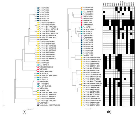 - Fraser-Smith, S.; Czislowski, E.; Meldrum, R.A.; Zander, M.; O’Neill, W.; Balali, G.R.R.; Aitken, E.A.B. Sequence variation in the putative effector gene SIX8 facilitates molecular differentiation of Fusarium oxysporum f. sp. cubense. Plant Pathol. 2014, 63, 1044–1052. [Google Scholar] [CrossRef]