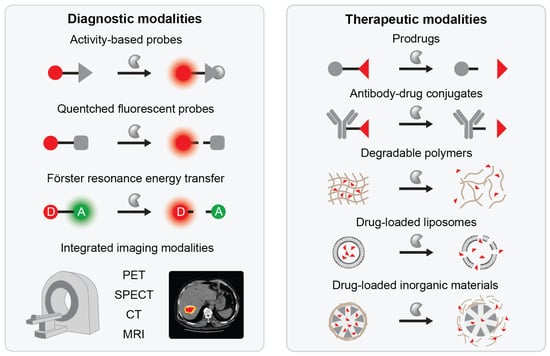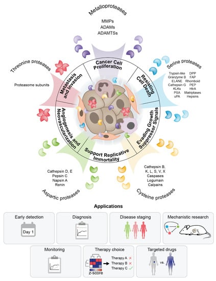 Past research provided solid evidence that proteases are heavily involved in the development and progression of cancer [9] and efforts to integrate them into cancer diagnosis and therapeutic management have grown [10]. In cancer, dysregulated proteases from different protease families are associated with a myriad of stages of development, extensive remodeling of the ECM (Extracellular matrix) [11,12,13], epithelial-to-mesenchymal transition [14], immune system evasion and hijacking [15], resistance to apoptosis signals [16], metastasis development [17,18,19], as well as tumor growth, invasion and metastasis spread [20,21,22]. Furthermore, proteases have roles in signaling pathways like MAPK (Mitogen-activated protein kinase), Akt (Protein kinase B) and TNFβ (Tumor necrosis factor β), among others, thereby exerting a substantial influence on cancer development and progression [23,24]. With the growing knowledge of protease molecular functions and characteristic activity patterns associated with cancer phenotypes, it has become clear that tumor-associated protease activity can be harnessed to develop diagnostic tools and biomarkers for early disease detection [10,25]. Moreover, the activity of disease proteases can be exploited for functional diagnostic imaging [26,27], translate into applications where proteases act as activators of prodrugs [28] or into protease-based drug delivery systems [29] to pave the way towards the next generation of clinical modalities as outlined in Figure 1.
