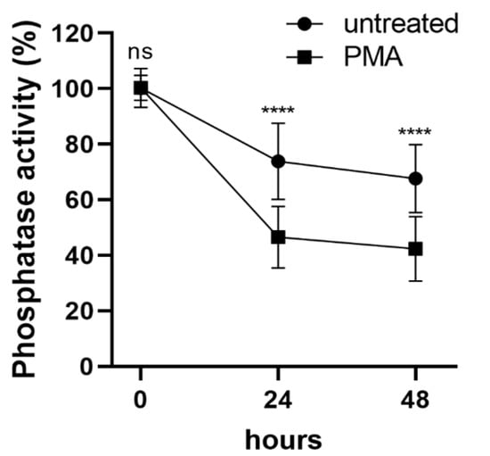 Protein phosphatase-1 (PP1) and -2A (PP2A) enzymes play important roles in cellular signaling pathways via dephosphorylation of a large number of phosphoproteins [22,23,24]; however, little is known about their function during monocytic differentiation. To determine the change in total PP1 and PP2A activity during PMA-induced differentiation we performed in vitro phosphatase activity assays of cell lysates using phosphorylated 20 kDa myosin light chain as substrate (Figure 1). Phosphatase activity (normalized to protein content) decreased with time in unstimulated THP-1 cells reaching approximately 68% of the initial value after 48 h. However, when THP-1 cells were stimulated with PMA, the decrease in phosphatase activity was even more pronounced, resulting in 46 to 42% residual activity after 24 or 48 h of differentiation, respectively. These data suggest that PMA-induced differentiation of THP-1 cells might be accompanied by inhibition of PP1 and/or PP2A.