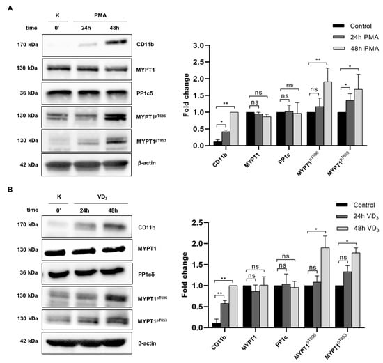 Changes in the expression and phosphorylation of myosin phosphatase subunits during PMA- and VD3-induced differentiation. THP-1 cells were stimulated with PMA (A) or VD3 (B) to induce differentiation, then cell lysates were prepared at the indicated times, and expression of CD11b, MYPT1, PP1cδ, MYPTpT696, MYPTpT853, and β-actin were analyzed by Western blotting. Densitometry analysis was performed with ImageJ to quantify band intensities. CD11b, MYPT1 and PP1cδ were normalized to β-actin, whereas MYPTpT696, and MYPTpT853 were normalized to total MYPT1. Histograms demonstrate fold changes relative to cells prior to differentiation (for MYPT1, MYPTpT696, MYPTpT853, and PP1cδ) or after 48 h PMA-treatment (for CD11b). Data were analyzed by two-way ANOVA followed by Dunnett’s multiple comparisons (n = 5, * p < 0.05, ** p < 0.01, ns: not significant).