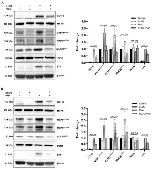 H1152 and EGCG activate myosin phosphatase and attenuate PMA-induced macrophage differentiation. THP-1 cells were pretreated with 10 µM H1152 for 30 min (A) or 20 µM EGCG for 1 h (B), then treated with PMA for 48 h. Expressions of CD11b, MYPT1pT696, MYPT1pT853, MLC20pS19, PCNA, and p21 were analyzed by Western blotting. The total MYPT1 and β-actin were used as loading controls. Histograms demonstrate fold changes of protein or phosphorylation levels relative to unstimulated cells (for MYPTpT696, MYPTpT853, MLC20pS19, and PCNA) or PMA-stimulated cells (for CD11b and p21). Data were analyzed by two-way ANOVA, followed by Tukey’s multiple comparisons (n = 5, * p < 0.05, ** p < 0.01, *** p < 0.001, ns: not significant).