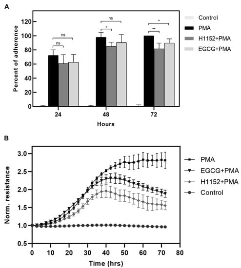 Effect of H1152 and EGCG on the adhesion of THP-1 cells upon PMA-induced differentiation. (A) THP-1 cells were pretreated with 10 µM H1152 for 30 min or 20 µM EGCG for 1 h, then stimulated with PMA. Non-adherent cells were removed at the indicated time points, and cells were stained with sulforhodamine B (SRB). The adherence of the cells was determined by quantification of SRB staining and expressed as percentage of PMA-stimulated cells at 72 h. Histograms represent the means of three independent experiments. Multiple t-test. * p < 0.05, ** p < 0.01. (B) THP-1 cells were treated as indicated. Cell adherence was measured in real-time by the Electric Cell-Substrate Impedance Sensing (ECIS) system. Normalized resistance is proportional to the strength of adherence. Resistance measurements were made in every minute and represent the average of three independent wells. Data were analyzed by two-way ANOVA followed by Dunnett’s multiple comparisons (n = 3, * p < 0.05, ** p < 0.01, ns: not significant).