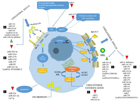 Some microRNA, such as miR-33 [], miR-19b [], miR-101 [], miR-144-3p [], miR-302a [], miR-26 [], miR-20a/b [] and miR-758 [] directly target the 3′UTR of ABCA1 in macrophages, which suppresses ABCA1 expression and disrupts cholesterol homeostasis. The disruption in cholesterol homeostasis occurs due to a decrease in the efflux of cholesterol to ApoA1 or HDL, which ultimately causes the formation of foam cells. A more detailed description is given in Table 1.