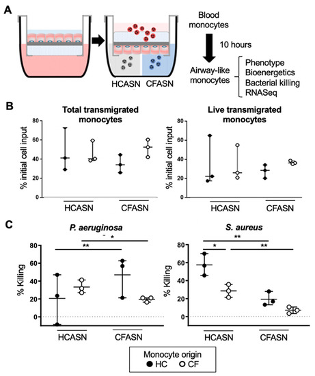 In this study, we mimicked the recruitment of primary human blood monocytes to CF vs. HC airways using a recently developed model [8,13,14] which uses a well-differentiated small airway epithelium and human airway supernatant as conditioning medium for transmigrated leukocytes. Our findings suggest that monocytes transmigrated into CFASN do not demonstrate broadly different changes in their surface phenotype and metabolism. However, they are less efficient at killing bacteria. Transcriptional profiling suggests broader changes in monocytes migrated to CFASN, notably in antimicrobial poise.