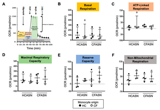 Next, we collected CF and HC blood monocytes transmigrated to CFASN or HCASN and subjected them to analysis of mitochondrial respiration using a Seahorse XFp system. We derived from the oxygen consumption rate (OCR) measure (Figure 2A) five distinct metrics: basal respiration (Figure 2B), ATP-linked respiration (Figure 2C), maximal respiratory capacity (Figure 2D), reserve capacity (Figure 2E), and non-mitochondrial respiration (Figure 2F). We did not observe any difference in the five metrics based on the origin of blood monocytes or ASN used.