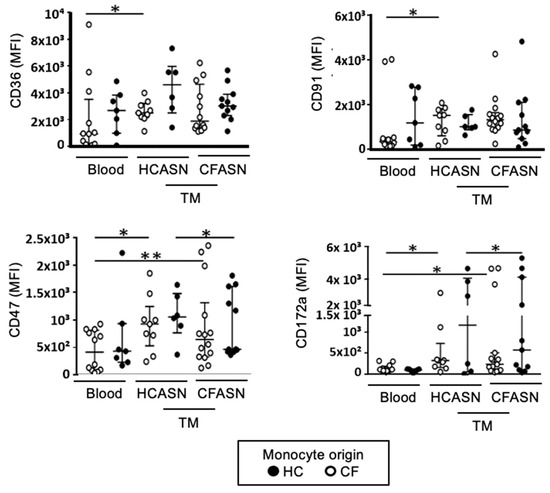 CD36 and CD91 were only significantly increased compared to baseline in CF monocytes transmigrated to HCASN. CD47 and CD172a were significantly increased compared to baseline in CF monocytes transmigrated to CFASN and HCASN, with significant differences between HC monocytes transmigrated to CFASN vs. HCASN for both.