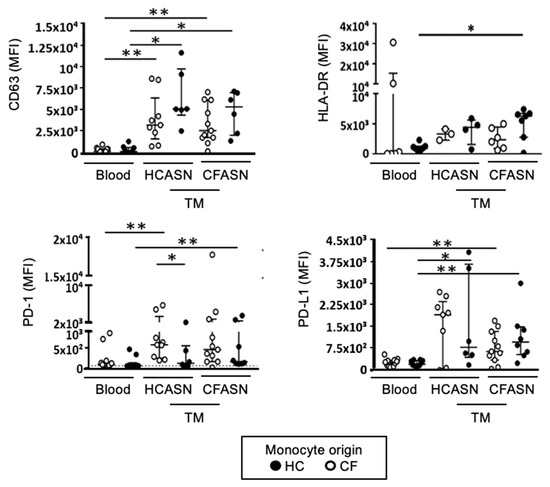CD63 was increased compared to baseline for both CF and HC monocytes transmigrated to CFASN and HCASN, but there was no difference between CF and HC monocytes within each ASN condition, or between ASN conditions within each type of monocyte; thus, the process of transmigration was responsible for significantly increasing CD63 expression. HLA-DR was only significantly increased compared to baseline to HC monocytes transmigrated to CFASN. PD-1 was increased compared to baseline in CF monocytes transmigrated to HCASN and HC monocytes transmigrated to CFASN, with a significant difference between CF and HC monocytes transmigrated to HCASN. Finally, PD-L1 was increased compared to baseline in CF monocytes transmigrated to CFASN and HC monocytes transmigrated to both CFASN or HCASN, and HC monocytes transmigrated to HCASN.