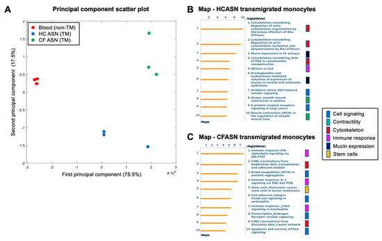 Transcriptomic analysis of transmigrated monocytes. (A) Principal component analysis of RNASeq data from healthy control blood monocytes prior to (non-transmigrated, red) and after transmigration (TM) to HC (blue) or CFASN (green) shows clear subsetting by condition (n = 3 independent biological replicates each). Pathway analysis by Metacore (right) illustrating differentially expressed genes and pathways in monocytes transmigrated to (B) HCASN and (C) CFASN, respectively, compared to blood monocytes.