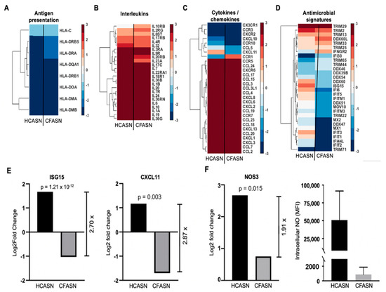 Analysis of differentially expressed genes (DEGs) related to immunity in monocytes transmigrated to HCASN vs. CFASN. Shown are chosen DEGs representative of (A) antigen presentation, (B) interleukins, (C) cytokines/chemokines, and (D) antimicrobial signatures. Shown in (E) are ISG15 and CXCL11, two genes with direct antibacterial functions, which are significantly downregulated in CFASN-recruited monocytes (Log2 scale for both), and in (F) the nitric oxide producing enzyme NOS3 (left panel, Log2 scale) and corresponding intracellular NO levels (right panel, shown as MFI).