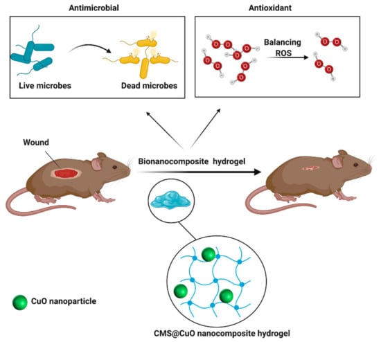 Abdollahi, Z.; Zare, E.N.; Salimi, F.; Goudarzi, I.; Tay, F.R.; Makvandi, P. Bioactive Carboxymethyl Starch-Based Hydrogels Decorated with CuO Nanoparticles: Antioxidant and Antimicrobial Properties and Accelerated Wound Healing In Vivo. Int. J. Mol. Sci. 2021, 22, 2531. https://doi.org/10.3390/ijms22052531