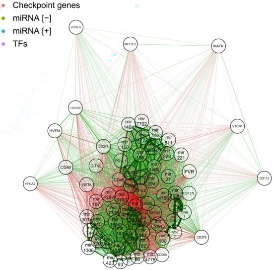 2.4. Network of Correlation Derived Interactions between miRNAs, Checkpoint Genes and TFs