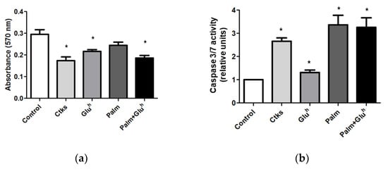 Under the same incubating conditions, 30 × 105 cells were cultured in 96-well plates. After 24 h, cultures were subject to the different experimental conditions: Control, CKs, Gluh, Palm, and Palm+Gluh for 48 h. Supernatants were discarded and 25 µl of MTT solution (Merck Chemicals Ltd, Darmstandt, Germany) at a concentration of 5 mg/ml was added to each well. After a 90-min incubation at 37 °C with 5% CO2, the samples were washed with warm PBS. PBS was eliminated before adding 100 µl of DMSO/well. Plates were covered and gently stirred for 20 min at room temperature (RT). Then, we measured the absorbance at 570 nm.