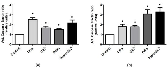 19]. Therefore, to gain a deeper insight of these initiator caspases’ role in 1.1E7 cells apoptosis, their activation in response to the diabetogenic stimuli was explored. Both caspase-8 and -9 were activated by all the treatments but following a different pattern: We found the highest caspase-9 activation in the cytotoxic model, while the lipotoxic and glucolipotoxic model resulted in an approximately 2-fold raise in active capase-8, suggesting that the high lipid concentration is more responsible for this effect than the high glucose concentration. To the best of our knowledge, this is the first evidence connecting the Palm treatment with the caspase-8 activation in β-cells of human origin. Of note, a recent prospective study in humans [