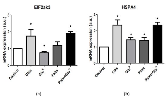 h culture, while EIF2a and HSPA5 mRNA amounts increased in the presence of Palm, potentiated in combination with Glu