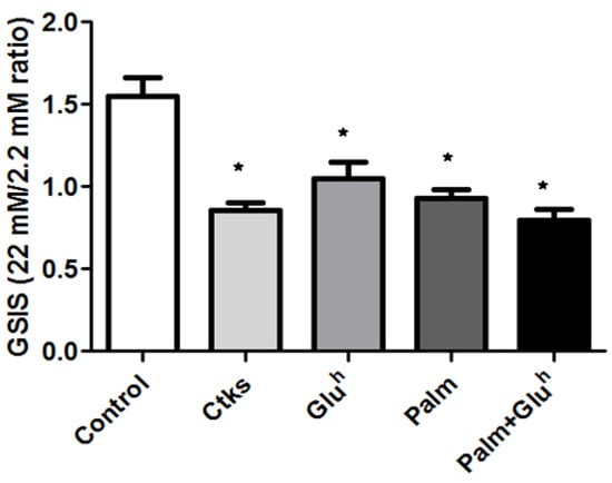 h and, afterwards, the glucose stimulated insulin secretion (GSIS) was quantified as the ratio of basal insulin release (as incubated with 2.2 mM of glucose for 60 min versus induced insulin release (incubating with 22 mM of glucose for 90 min). The untreated control cells responded to the glucose challenge (22 mM) increasing their basal secretion by 50%, for a mean GSIS ratio of 1.5. The remaining study conditions, CKs, Glu