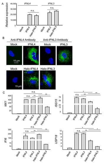 Consistent with the previously published data [,], IFNL3 and IFNL4 were not detectable in 48 h mock-transfected HuH7 cells by RT-PCR and confocal microscopy (Figure 1A,B and Supplementary Figure S1). The cells transiently transfected with Halo-tagged and non-tagged forms of IFNL3 or IFNL4 showed similar mRNA expression levels of the corresponding interferons (Figure 1A).