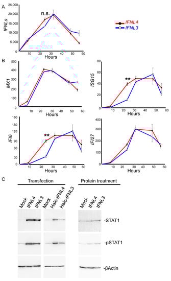 IFNL3 and IFNL4 induce comparable JAK-STAT activation. (A,B) Kinetics of ISG expression in wild type HuH7 cells transfected with non-tagged IFNL3 or IFNL4. Relative expression of IFNL3, IFNL4, MX1, ISG15, IFI6 and IFI27 calculated to time point 0 is depicted. The data were collected at 8, 24, 32, 48 and 56 h after transfection. The results are presented as a mean ± SEM (n = 4). The changes following transfection with IFNL4 and IFNL3 are shown in red and blue, respectively. GAPDH was used as internal control. Differences were considered significant at ** p < 0.01. Relative expression of ISGs culminated between 32 and 48 h after the transfection. (C) The activation of JAK-STAT signaling was determined by immunoblot analysis of wild type HuH7 cells that were either transfected with non-tagged or Halo-tagged IFNL3 or IFNL4 for 48 h or stimulated with IFNL3 or IFNL4 proteins for 24 h. Empty plasmid was used as a mock control, ßActin served as the loading control. Equal volumes of 4 biological replicates were loaded in each lane.