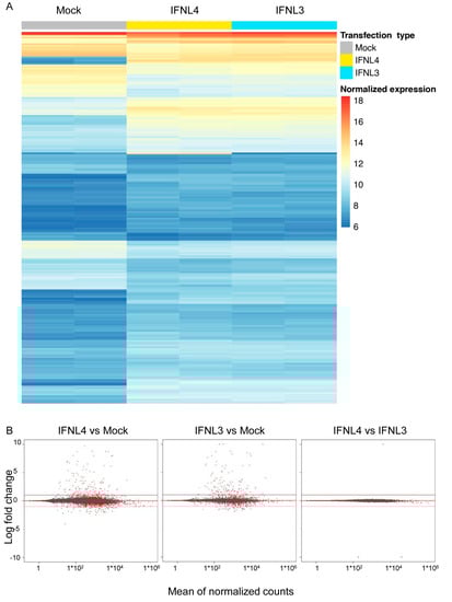 Both IFNL3- and IFNL4-transfected cells displayed similar expression profiles as documented by the heat map representing 1000 most expressed genes depicted in Figure 4A. Moreover, we performed generalized linear regression with counts modeled using negative binomial distribution displayed as MA plots (Figure 4B) and found a number of differentially expressed genes between IFNL3 vs. mock and IFNL4 vs. mock transfected cells represented by red dots; however, we did not find a single pathway differentiating IFNL4- from IFNL3-overexpressing cells by KEGG and GO analysis. Only three genes, namely, IFNL4, IFNL3 and IFNL2, were found as differently expressed, which is not surprising since transfections induced high expression of IFNL3 or IFNL4. Since IFNL3 and IFNL2 are paralogue genes with 98% of cDNA sequence similarities, RNAseq analysis likely assigned some reads originating from IFNL3 mRNA as IFNL2.