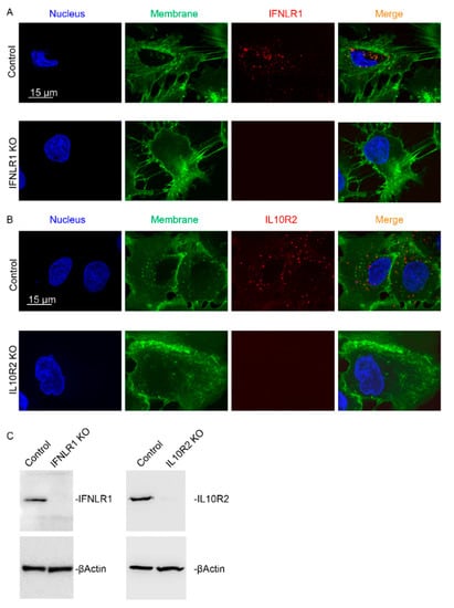 Characterization of IFNLR1 and IL10R2 knockout cell clones. High resolution confocal immunofluorescence images (A,B) and immunoblot analysis (C) of IFNLR1 and IL10R2 were performed in control and CRISPR/Cas9 edited HuH7 cells. Nuclei are shown in blue, membrane in green, IFNLR1 and IL10R2 are presented in red. Scale bar 15 µm. Representative pictures from several knockout clones are shown (A,B). An equal amount of several knockout clones was loaded per lane for Western blot analysis of IFNLR1 (n = 5) and IL10R2 (n = 2) (C).