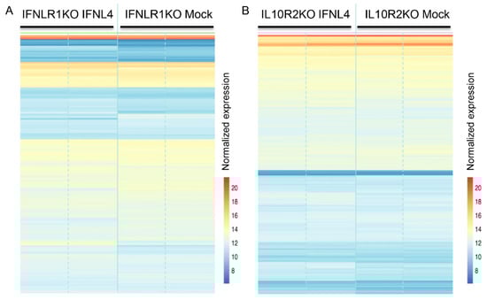 Gene expression profiles of IFNLR1 and IL10R2 KO cells transfected with IFNL4. Heat map of 1000 most expressed genes determined by RNAseq analysis of IFNLR1 −/− (A) and IL10R2 −/− (B) HuH7 cells transfected with non-tagged IFNL4 for 48 h. Empty plasmid was used as a mock control. Two biological replicates were used per each group. Color represents gene expression from blue (downregulated) to red (upregulated). Fragment counts were normalized using the variance stabilizing transformation.