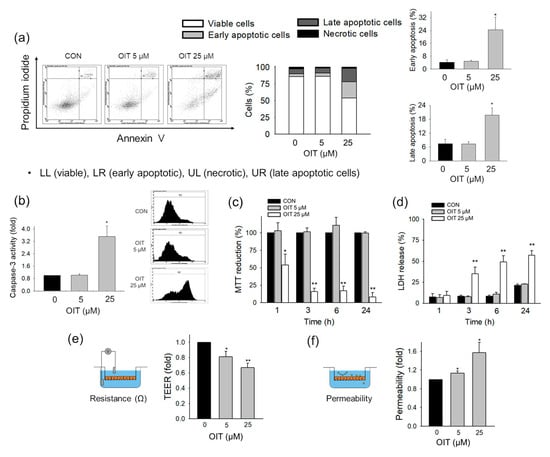 First, we investigated the effects of OIT, an IT biocide, on cell death using brain endothelial bEnd.3 cells as in vitro BBB models. We examined the OIT-induced phosphatidylserine (PS) exposure and plasma membrane leakage, which are phenomena observed in apoptosis and necrosis []. Both early and late apoptotic cells significantly increased 24 h after treatment with 25 μM OIT (Figure 1a). Since caspase-3 plays a pivotal role during the intrinsic or extrinsic pathway of apoptosis [], we examined caspase-3 activity after OIT treatment. Caspase-3 activity significantly increased 3 h after treatment with 25 μM OIT (Figure 1b). To identify the time course of OIT-induced changes in metabolic capacity and plasma membrane integrity, we examined the MTT reduction and LDH release 1, 3, and 6 h after OIT treatment. MTT reduction was significantly impaired by OIT 1 h after treatment, while the release of LDH increased 3 h after treatment (Figure 1c,d).