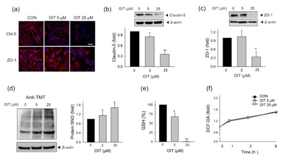 Effects of OIT on tight junction protein expression, protein S-nitrosylation (SNO), reduced glutathione (GSH), and total cellular ROS levels. (a) Immunofluorescence staining with claudin-5 or ZO-1 was performed in the OIT-exposed bEnd.3 cells and visualized by confocal microscopy at 24 h after OIT treatment (n = 3). Scale bar: 20 μm. (b,c) The protein levels of (b) claudin-5 and (c) ZO-1 were determined 24 h after treatment with 5 and 25 μM OIT (n = 3). (d) The level of SNO-modified proteins was detected at 1 h after treatment with 0, 5, or 25 μM OIT by the detection of the TMT-labeled S-nitrosylated proteins in western blot (n = 3). (e) The level of reduced GSH was measured at 24 h after treatment with OIT (n = 3). (f) Total cellular ROS was detected at 0, 1, 3, and 6 h after treatment with OIT (n = 3). Data are presented as mean ± SEM. * p < 0.05, ** p < 0.01 vs. CON (control).
