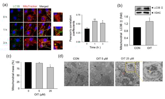 Since mitochondrial quality control systems are crucial for maintaining mitochondrial function [], we investigated the effect of OIT on mitochondria-specific autophagy, mitophagy, which is involved in the specific removal of impaired mitochondria. Confocal microscopy revealed that Light Chain 3B (LC3B), an autophagic indicator, was co-localized with the MitoTracker, a red-fluorescent dye that stains mitochondria, after OIT treatment (Figure 4a). The level of LC3B-II, a marker of autophagosome formation, significantly increased in the mitochondrial fraction (Figure 4b). The activation of mitophagy is known to affect mitochondrial dynamics and change the mass of mitochondria. The mitochondrial mass in brain ECs significantly decreased 3 h after treatment with 25 μM OIT (Figure 4c). Next, we examined the OIT-induced changes in mitochondrial morphology and autophagosome formation using transmission electron microscopy (TEM). Swollen mitochondria with distorted cristae were observed, and mitochondria-containing vesicles, which represent the stress-induced mitophagy in organs with high ATP demands, were found in OIT-treated bEnd.3 cells (Figure 4d).