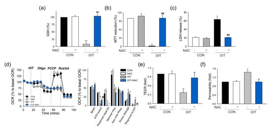 Reversal effects of N-acetyl L-cysteine (NAC) against OIT-mediated effects on GSH level, cell viability, mitochondrial metabolic activity, and endothelial barrier function. (a–c) bEnd.3 cells were pre-treated with NAC for 2 h, and then, the media were replaced by OIT (25 μM)-containing media. (a) The level of reduced GSH was determined in cells 24 h after OIT treatment (n = 3). (b,c) The extent of (b) MTT reduction and (c) LDH release was measured in cells 24 h after OIT (25 μM) treatment (n = 3). (d) bEnd.3 cells were pre-treated with NAC for 1 h and incubated for an additional 1 h with assay media containing NAC during degassing. OIT was then acutely injected into the cells. The profile of the OCR was plotted, and parameters for mitochondrial respiration were calculated (n = 3–4). (e,f) Measurement of (e) TEER and (f) FITC-dextran permeability was conducted in bEnd.3 cells 24 h after OIT (25 μM) treatment with or without NAC pre-treatment. Data are presented as mean ± SEM. * p < 0.05, ** p < 0.01 vs. CON (control); # p < 0.05, ## p < 0.01 vs. OIT-treated cells.