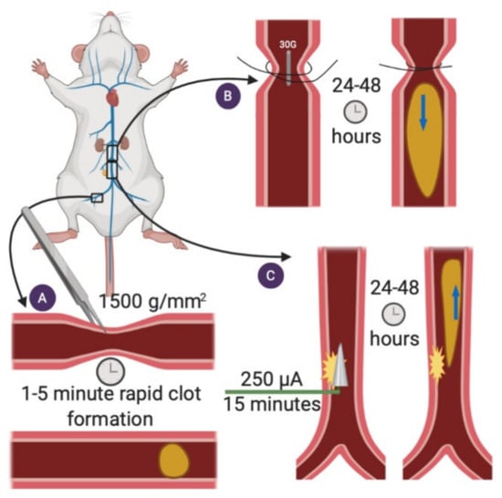 The electrolytic IVC model is a venous thrombosis mouse model that produces a non-occlusive thrombus in the presence of continuous blood flow (Figure 1C). Applying constant direct current to a copper wire inserted into the IVC generates free radicals, which then activate endothelial cells and initiate thrombosis []. Similar to humans, thrombi produced in the electrolytic IVC model form in the direction of blood flow (unlike the stenosis model where the thrombus grows in opposition to flow). Thrombus weight is both current and time-dependent [].