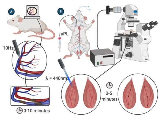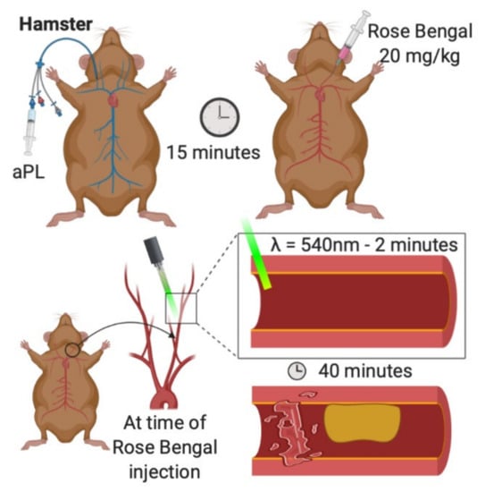 Photochemically induced carotid thrombosis has been used to simulate APS in hamsters [] (Figure 2). Rose Bengal is a photosensitizing fluorescent dye that produces reactive oxygen species and focal vascular endothelial damage following exposure to green light. Beyond hamsters, the photochemical carotid model has been commonly used in vascular studies of thrombosis in other rodent species, including mice, although not to our knowledge in the context of APS [,,].