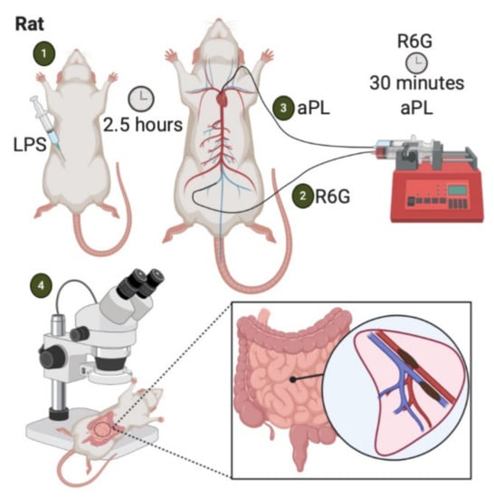 The murine bacterial lipopolysaccharide (LPS) priming model is used to investigate APS-associated thrombosis within the mesenteric microcirculation [] (Figure 4). In this model, a non-localized inflammatory stimulus, LPS, acts as the prothrombotic trigger rather than mechanical (pinch, stenosis)- or physicochemical (photochemical, FeCl3)-mediated endothelial injury.