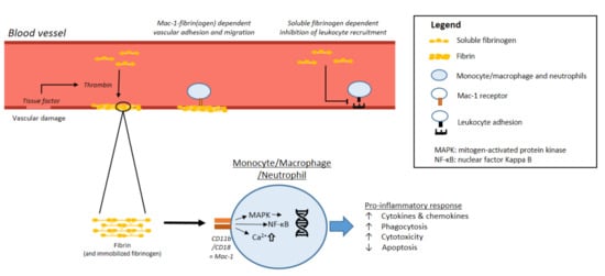 In general, immobilized fibrin(ogen) induces a Mac-1 dependent pro-inflammatory response. [] Immobilized fibrin(ogen)-Mac-1 interactions result in cell activation, illustrated by increased intracellular Ca2+, NF-ĸB and MAPK-pathway activation [,,,,,]. Additionally, both monocytes and neutrophils demonstrate an immobilized fibrin(ogen) dependent increase in adhesion, migration, phagocytosis, degranulation, cytokine/chemokine release, and apoptosis delay [,,,,,,,,,]. Soluble fibrinogen, however, is a relatively poor Mac-1 ligand and does not activate or induce signaling in neutrophils [,]. Nonetheless, circulating soluble fibrinogen levels partially diminish the inflammatory response. High concentrations of soluble fibrinogen, as present during acute phase reactions, dose-dependently reduce neutrophil adhesion under flow conditions [,]. These observations suggest opposite functions of soluble and immobilized fibrin(ogen), illustrated in Figure 2. Even though soluble fibrinogen is a poor ligand for Mac-1, the proposed low-affinity interaction between the two might execute its anti-inflammatory function; saturation of the Mac-1 receptor in milieus with high levels of soluble fibrinogen may compete with immobilized fibrin(ogen) for Mac-1 mediated leukocyte activation. Another hypothesis considers an auto-inhibitory effect of soluble fibrinogen through binding with its own immobilized or converted isoform. Soluble fibrinogen then forms a protective layer to shield the immobilized fibrin(ogen) and prohibit pro-inflammatory leukocyte adhesion and activation []. Taken together, soluble fibrinogen and immobilized fibrin(ogen) execute paradoxical effects with, respectively, an anti- and pro-inflammatory response.