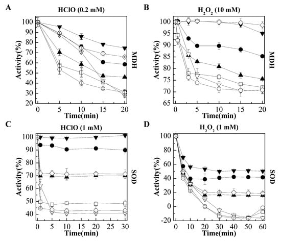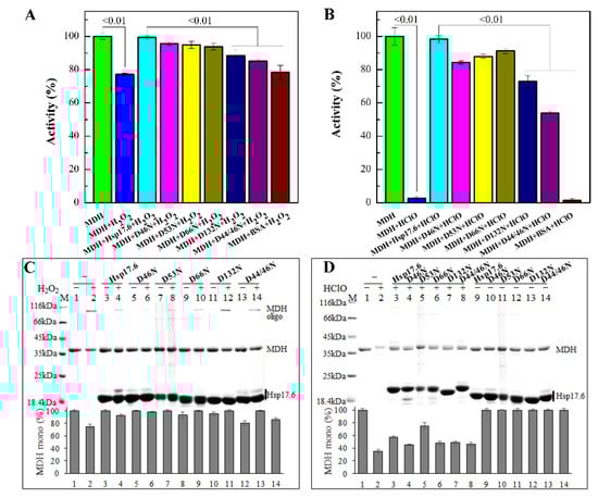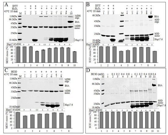 2.4. Hsp17.6 Appeared to Alleviate the H2O2-Oxidized Disulfide Linking and the HClO-Induced Degradation of Proteins