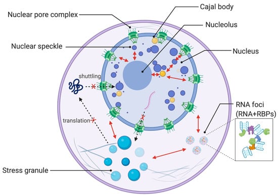 Membrane-less organelles that are affected by amyotrophic lateral sclerosis (ALS)-related RNA-binding proteins. Membrane-less organelles described in this review are illustrated, including the nucleolus, nuclear speckle, Cajal body, stress granule, along with RNA foci and nuclear pore complex. Dysregulation of RNA-binding proteins (RBPs) such as ALS-causing mutations leads to abnormal dynamics and function of the nucleolus, nuclear speckles, Cajal bodies, and stress granules. This dysfunction of membrane-less organelles is also interconnected to nucleocytoplasmic shuttling and RNA foci that may sequestrate RNA-binding proteins. These ALS-related cellular abnormalities influence each other. Created with BioRender.com.