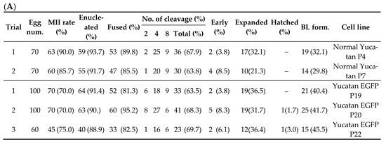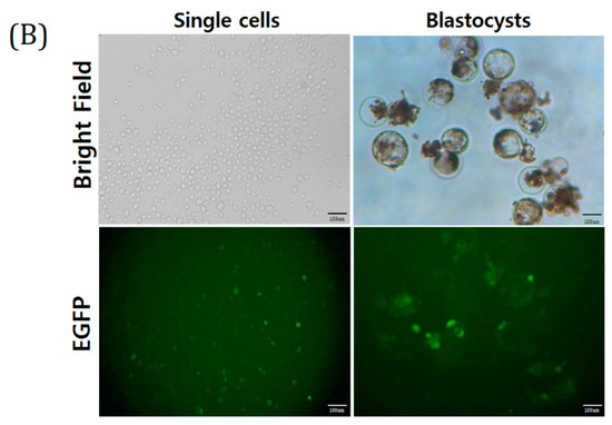 The TG donor cell line (Yucatan EGFP) used for SCNT was obtained from Kim’s Lab (Korea University, Seoul, Korea). This is a Yucatan miniature pig cell line that shows EGFP expression. SCNT was performed by selecting only mature oocytes in metaphase II (MII). The MII oocytes were washed using calcium-free HEPES-buffered Tyrode’s medium (0.05% w/v) containing 0.2% bovine serum albumin (TLH-BSA). Enucleation was performed using a 16-mm glass pipette (Humagen, Origio, Charlostesville, VA, USA) from a micro-manipulator in TLH containing 5 μg/mL cytochalasin B. After enucleation, trypsinized TG donor cells were transferred into the perivitelline space of enucleated oocytes, which were then fused by two pulses with a direct current of 180 V/mm for 60 μs in a 260 mM mannitol solution containing 0.1 mM CaCl2 and 0.05 mM MgCl2 using a cell fusion generator (LF201; Nepa Gene, Chiba, Japan). After electrical fusion, the SCNT embryos were incubated in 30 µL porcine zygote medium (PZM) droplets with 6DMAP (0.4 μg/mL demecolcine and 6-dimethyl aminopurine) for 4 h post-activation. Finally, the embryos were transferred to PZM droplets for IVC. On the second day after fusion, embryo CL was evaluated (1-cell, 2–3-cell, 4–5-cell, 6–8-cell stages, and fragmented embryos) and transferred to new PZM droplets. On the 4th day, the embryos were transferred to PZM droplets containing 10% fetal bovine serum (FBS). On the 7th day after fusion, BL formation was evaluated quantitatively (early, expanded, and hatched BL).