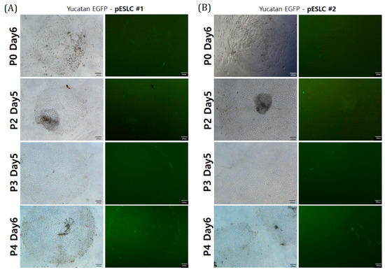The BLs with the EGFP gene produced by SCNT were seeded onto MEF feeder cells. On the 7th day after seeding, two primary growths were observed from SCNT BL derived from Yucatan EGFP P19. Colonies from the early passage had an irregular colony morphology and uneven colony margin and showed a low cell density, representing a mixed pattern of differentiated cells and pESLCs. However, with increasing passaging of the cell line, the colonies had a regular morphology, even margin, and higher cell density, demonstrating typical characteristics of common pESLCs. Morphologically, two pESLC lines with a primed pluripotent state morphology were established. Expression of EGFP was mainly observed at the margin (Figure 2).