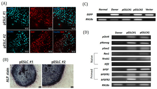 The characteristics of the two established Yucatan EGFP pESLC lines were analyzed. First, expression of the pluripotent marker OCT4 in the pESLC line was confirmed by immunofluorescence staining (Figure 3A). Alkaline phosphatase (ALP) staining further showed that both pESLC lines had ALP activity in the colonies except for those in MEF feeder cells (Figure 3B). Reverse transcription (RT)-PCR evaluation for the expression of naïve (Rex1, Nrob1, and Klf2) and primed (bFGF, bFGFR1, and bFGFR2) pluripotent state markers confirmed the expression of the primed pluripotent state marker in both pESLC lines. In particular, the expression of the naïve pluripotent state marker Rex1 was partially confirmed in pESLC line #2. In addition, the undifferentiated pluripotent cell markers pOct4, pNanog, and pSox2 were identified in both pESLC lines (Figure 3D). Additionally, the presence of the inserted EGFP gene was confirmed by PCR using gDNA. The EGFP gene was present in the two pESLC lines (Figure 3C). These findings confirmed the successful insertion of EGFP gene and expression of pluripotency markers.