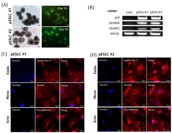 EB formation was induced to confirm the ability of the established cell lines to differentiate into the three germ layers of the established pESLC lines. On the 10th day, spherical EBs expressing EGFP were formed (Figure 4A). The expression of the three-layer markers AFP (endoderm), DESMIN (mesoderm), and CRABP2 (ectoderm) was confirmed by RT-PCR in all EBs derived from Yucatan EGFP pESLC lines (Figure 4B). Expression of Cytokeratin 17 (endoderm), Desmin (mesoderm), and Neurofilament (ectoderm) in both pESLC line-derived embryos was confirmed by immunofluorescence (Figure 4C,D). These results confirmed the differentiation potential of the pESLC lines into the three germ layers.