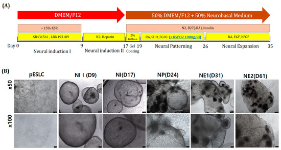 For aggregation, only pESLC colonies were detached from ICR MEF cells and then mechanically cut into several pieces. These pieces were placed in an Ultra-Low Attachment 24-Well Plate (Corning® Costar® Ultra-Low Attachment 24-Well Plate; Corning, Inc., Corning, NY, USA) and cultured for 3 days in pESLC medium without bFGF. Neural induction (NI) I medium was supplemented with 15% KnockOut Serum Replacement (KSR; Gibco) in DMEM/F12 (Gibco) and additional dSMADi, 10 μM of SB431541 (a transforming growth factor-β inhibitor), and 100 nM LDN193189 (a BMP4 inhibitor; Stemgent Inc., San Diego, CA, USA). The neuro-organoids were incubated for 9 days, and NI I medium was added after pESLC aggregation. Subsequently, the NI II medium was supplemented with 1× N2 (Gibco) and 1 µg/mL heparin (STEMCELL Technologies) in DMEM/F12 medium. The neuro-organoids were incubated for 8 days in NI II medium. Experiments were conducted using DN medium comprising DMEM/F12 and neurobasal medium (Gibco) at a 1:1 ratio along with N2, B27 (Gibco), and 10 µg/mL insulin. In the gel-coating step, 2% Geltrex, a basement membrane matrix, was mixed with DN medium for 2 days. In the neural patterning (NP) step, 0.5 µM retinoic acid (RA), 500 ng/mL sonic hedgehog (SHH; PeproTech, Rocky Hill, NJ, USA), 50 ng/mL FGF8, and 100 ng/mL RSPO2 (3266-RS-025; R&D System, Minneapolis, MN, USA) were added to the DN medium and the neuro-organoids were cultured for 7 days. In the neural expansion (NE) step, RA, 10 ng/mL EGF, and 4 ng/mL bFGF (BioBud, Seongnam-si, Gyeonggi-do, Korea) were added to the DN medium, followed by incubation.