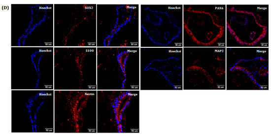 In the NE phase, bFGF and EGF were added to the DN medium for neuro-organoid culture. In general, bFGF and EGF promote the proliferation, survival, and self-renewal of neural stem cells and progenitor cells [23,24]. In particular, bFGF has been reported to stimulate the development of astroglial and oligodendroglial cells, facilitate neural cell survival, and promote neurite outgrowth [25]. As a result, the neuro-organoids were cultured until day 61 and the expression of MAP2, PAX6, S100, SOX2, and Nestin was confirmed by Immunofluorescence staining (Figure 6D). This indicates that multiple stages of neural cells are present together in a single neuro-organoid.