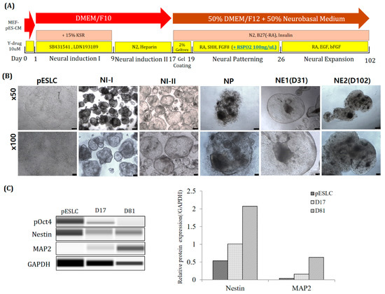 (Long-term) Progression of 3D Neuro-organoid development from Yucatan EGFP pESLCs. (A) Schematic diagram of the 3D neuro-organoid method and timing. (B) Image of neuro-organoid according to differentiation stage. Scale bar: ×50 = 250 um, ×100 = 100 um. (C) Result of Western blot.
